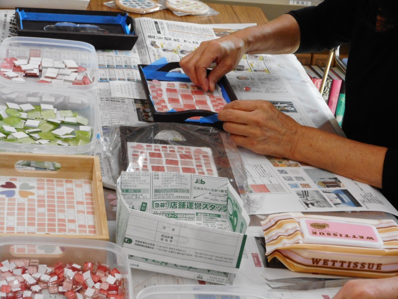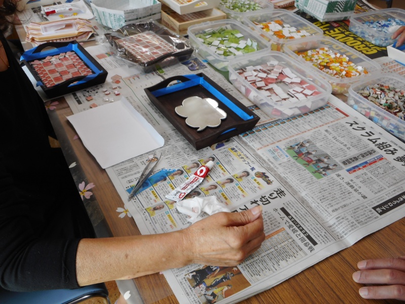 一見簡単そうに見えたのですが、配置やデザインを考えてからトレーにタイルを並べ、接着剤で貼り、乾いたら目地材を塗り込み、乾燥させ、ふき取る作業を青木先生の指導のもと、なんとか完成し、自分だけのマイトレーに皆さん、大満足 !