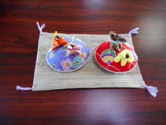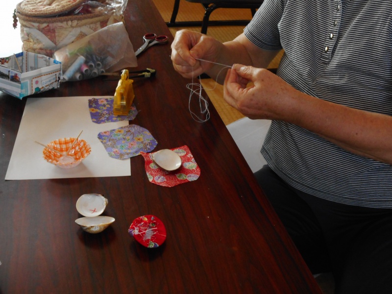 前期のちりめん教室では真っ赤なさるぼぼ人形を作り、今回は小さなミニさるぼぼ人形と貝がらを組み合わせてこちらも可愛い作品ができました。