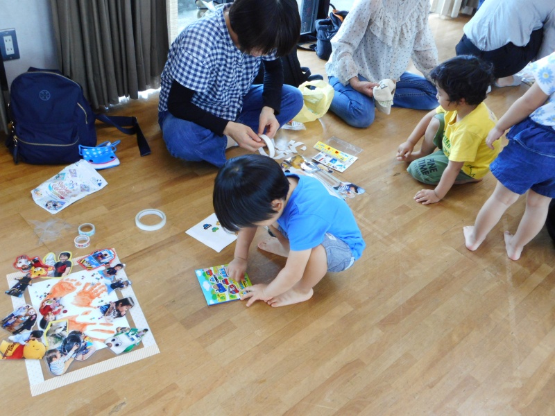 前回休んだ親子は文化祭の作品作りをしましたが、完成している親子は大きなボールで遊びんだり運動をしました。体くらいあるボールを遊ぶことは初めての体験で、子ども達は大はしゃぎ !!
