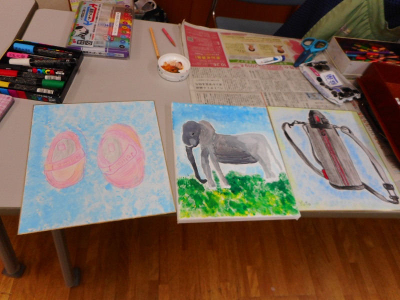 今回はアクリル絵の具を使ってキャンパスに自由に描く作品をしました。