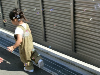 シャボン玉ができた時は大喜びで、楽しんでいました。