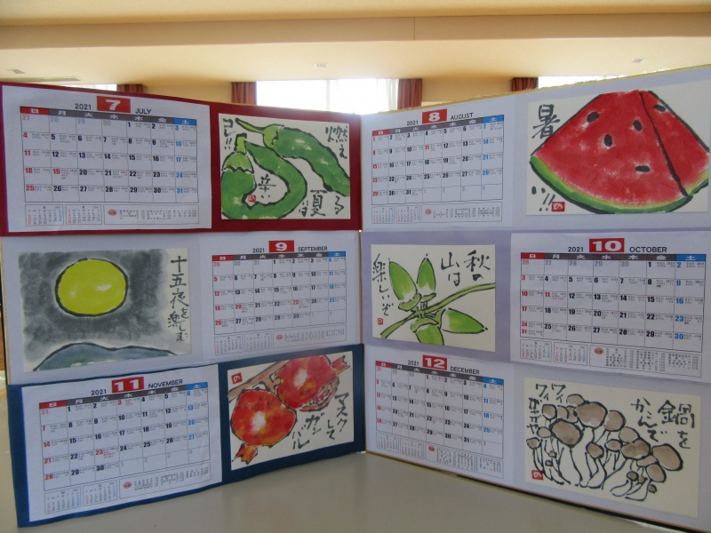絵手紙同好会”虹“では、からくりカレンダーを制作中です。優しい色使いで見ているだけでも楽しくなる作品ばかりです。