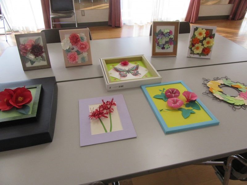 作品は全て紙でできていますが、繊細な細工がしてありとてもきれいです。サーモンピンクの椿をメインに小花や緑の葉もあしらい、お正月らしい飾りになりました。