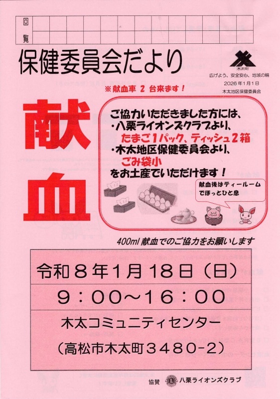 予約先 木太コミュニティセンター(087-834-5547)
