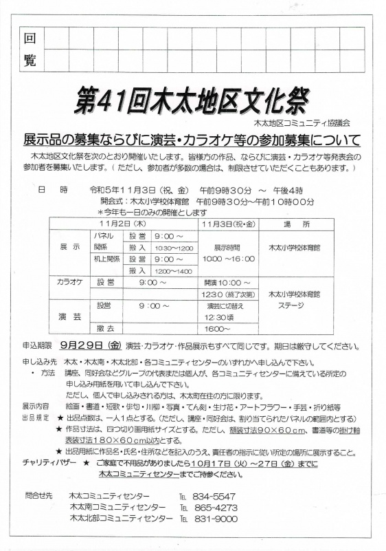 木太地区文化祭を次のとおり開催いたします。皆様方の作品、